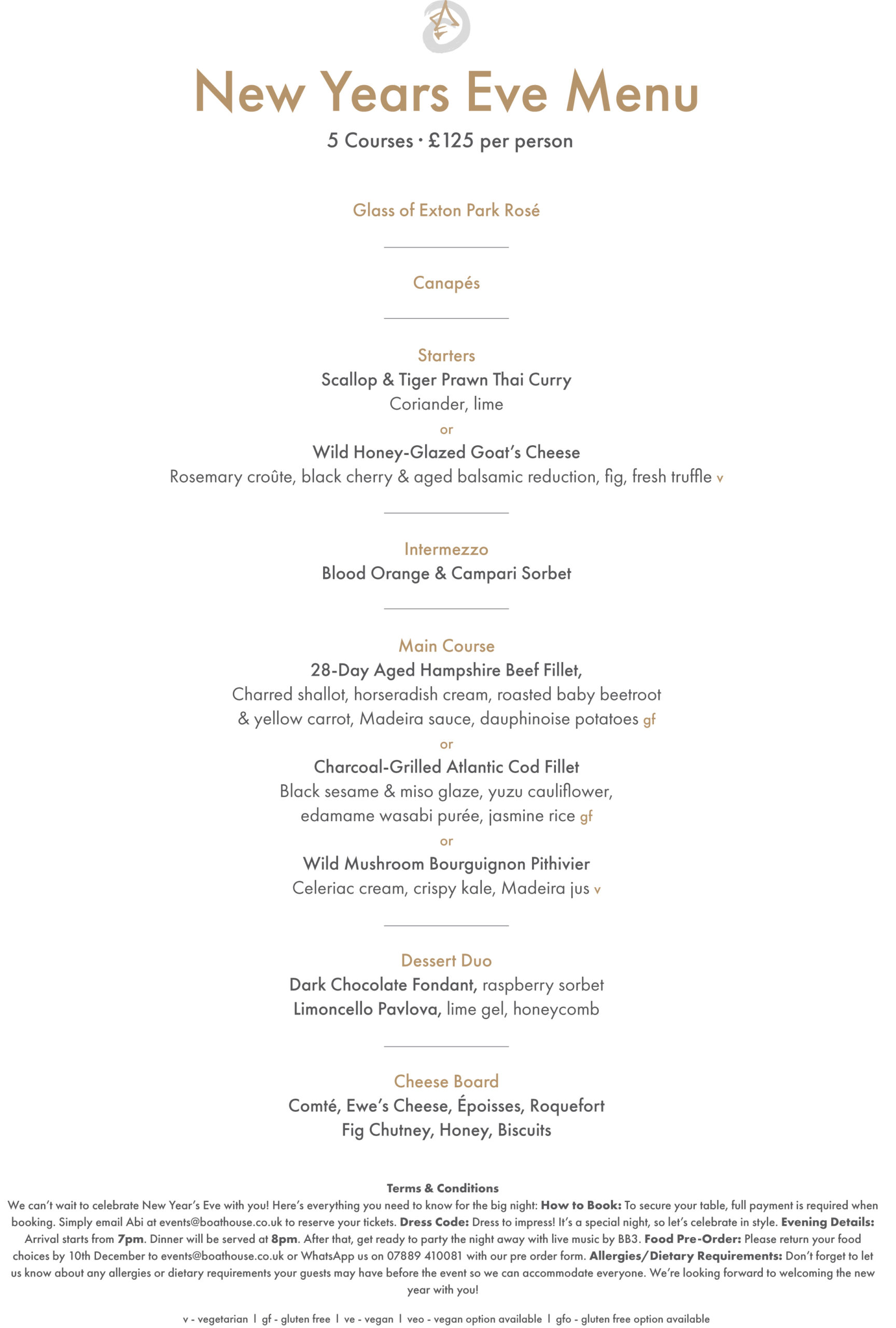 Enjoy a glass of Exton Park sparkling wine on arrival, a special five course New Year’s Eve set menu and live music all evening from BB3 for you to dance the night away to!